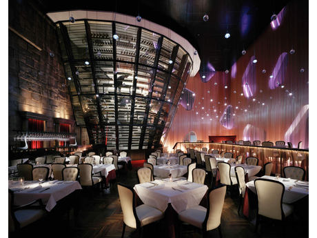 9mの高さの天井からスワロフスキーで作られた照明がキラキラと輝くダイニングフロア。